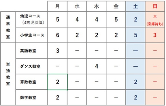 入会にあたっての曜日別の空き状況です。