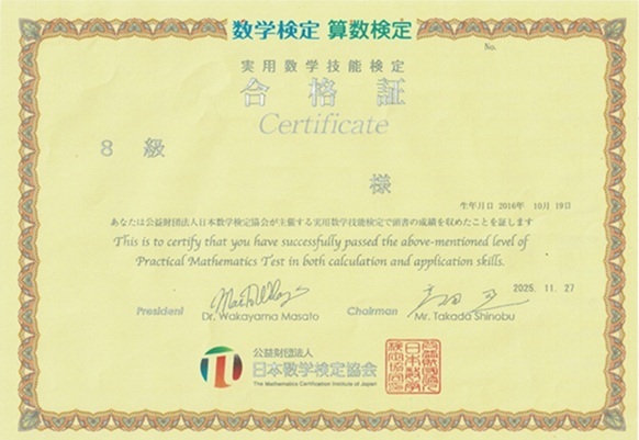 (写真:スタッフ)算数検定8級合格